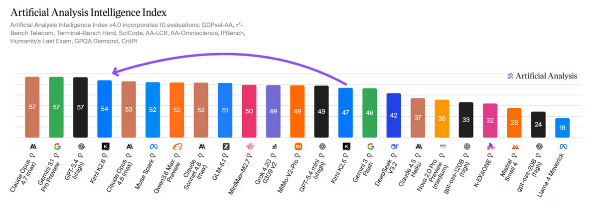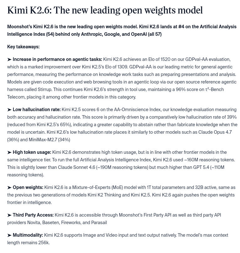 Ensuite je regarde les articles (https://artificialanalysis.ai/articles) d'Artificial Analysis, pour voir s'ils ont publié un nouvel article sur ce modèle. Généralement, ils sont très réactifs. Voici un exemple concernant Kimi K2.6 : Kimi K2.6: The new leading open weights model.