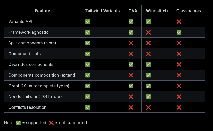 Voici un tableau comparant les fonctionnalités de tailwind-variants et class-variance-authority :